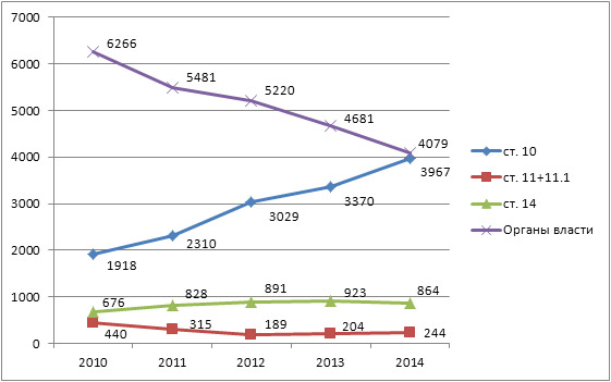 Из графика видно, что, несмотря на заметную тенденцию к снижению общего количества правонарушений, допущенных органами власти, они все еще составляют самую многочисленную группу нарушений антимонопольного законодательства.